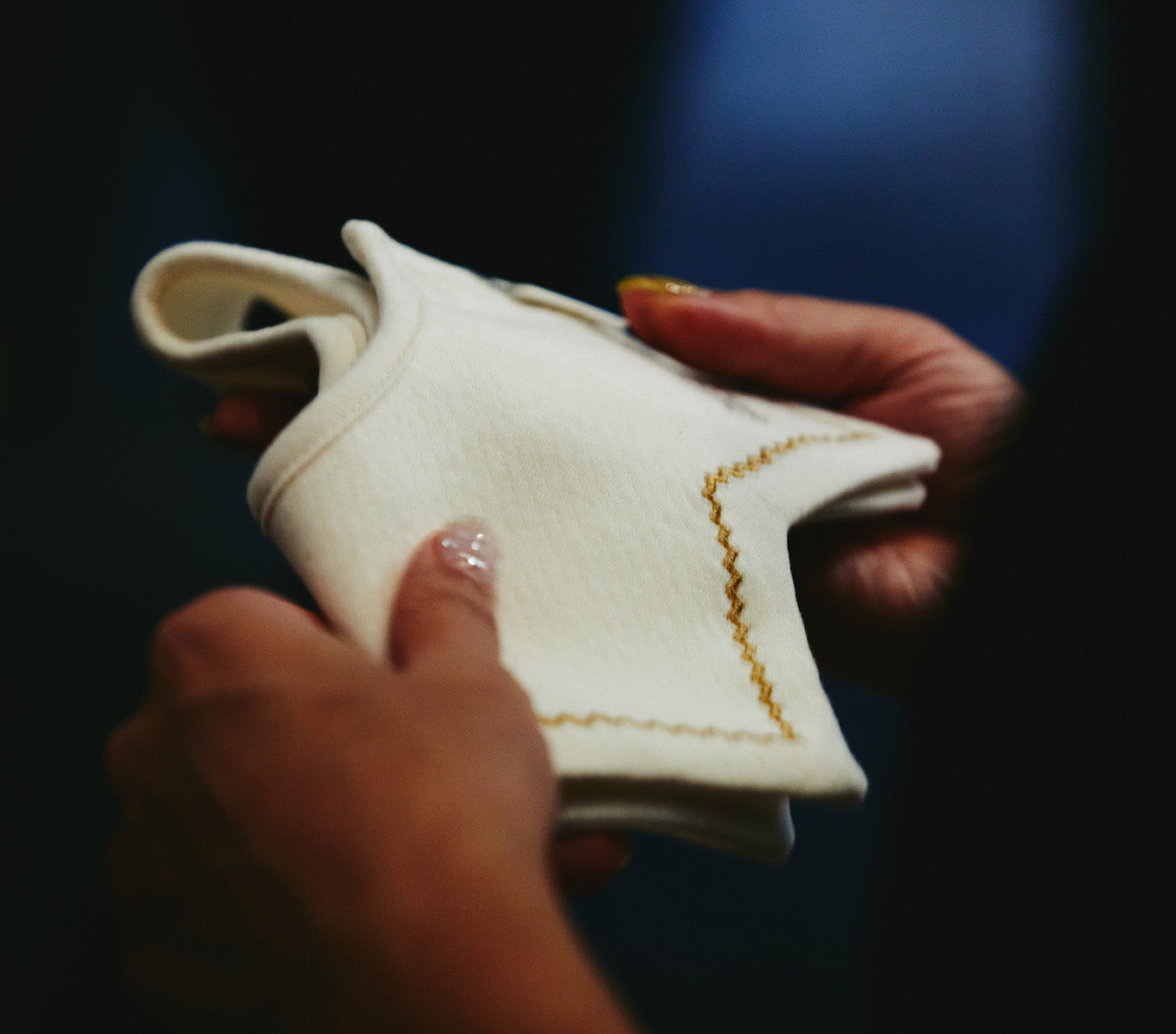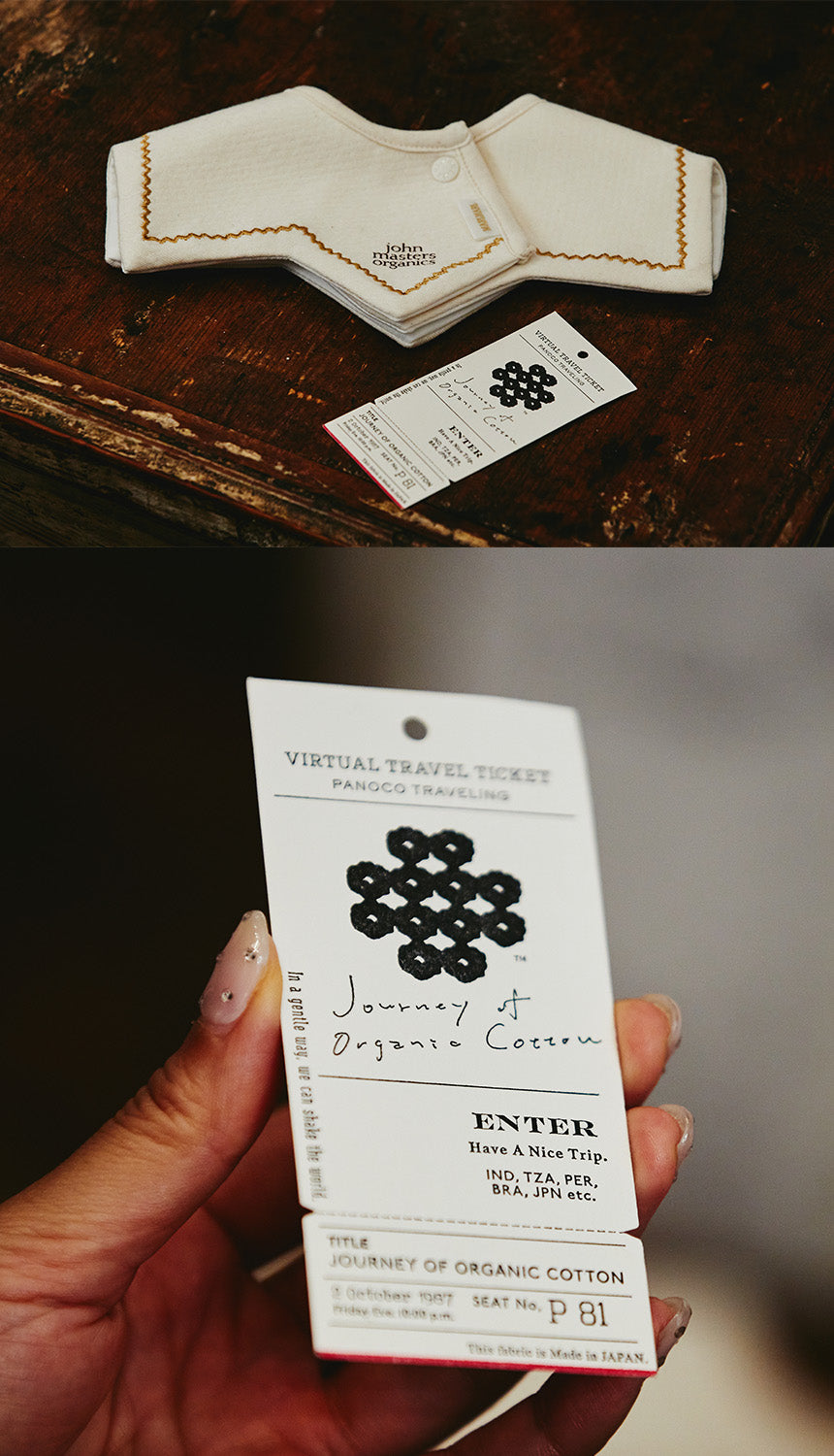「今回のコラボレーションでは、これまでに使ったことのない特別なオーガニックコットン生地を使用したいとの両社の思いから、新しい提案の切り口として“Journey of Organic Cotton”というサービスを採用しました。コットンを無農薬でつくるのは非常に大変で、さらにコットンをはじめ、生地のトレーサビリティを明らかにするのは難しいと言われています。“Journey of Organic Cotton”は使用されているコットンの産地から生地に至るまでの製造工程を明らかにしているのが特徴で、下げ札に付いているQRコードをスマートフォンで読み込むと、どこで栽培された綿花なのか、どこで糸になり生地になったのか、物づくりについて知ることが出来ます。これはSDGsの観点からも重要で、子どもたちの未来のためにも、地球のことを考えるきっかけになって欲しいとの想いが込められています。また、素材をつくるところからとことんこだわった生地を生かすためにあえて染色をせず、刺繍だけ施してそのまま使用。生地の肌触りの柔らかさ、コットン由来の自然な色合いを最大限に生かすデザインになっています」