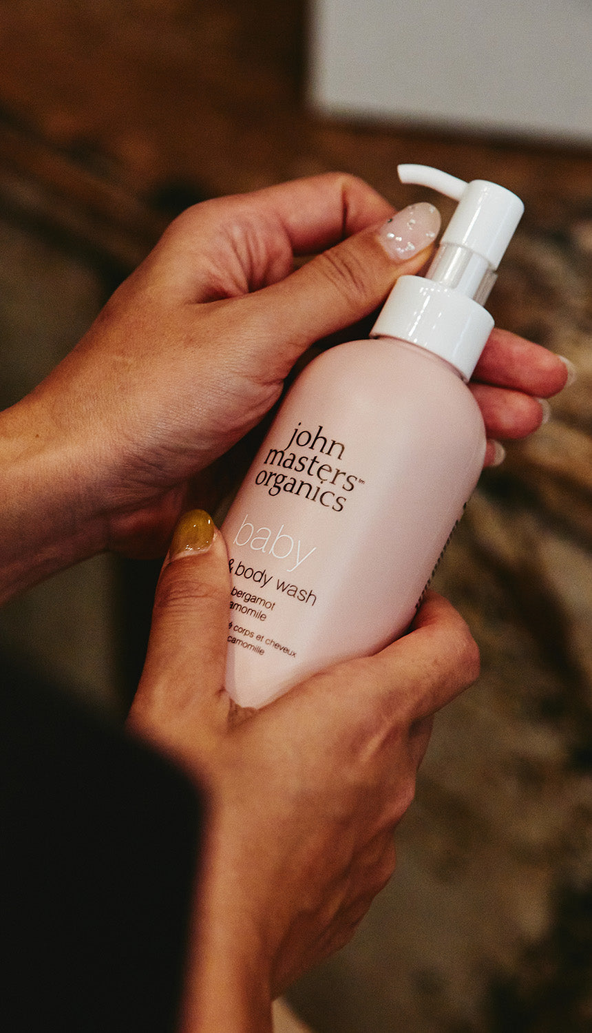 また、ジョンマスターオーガニックが新たに展開するベビーケア製品のパッケージは、グレイッシュピンク。ジェンダーフリーも意識して、女の子に向けた可愛いピンクではなく、ちょっとくすんでいて大人もインテリアとして楽しめる色を採用している。