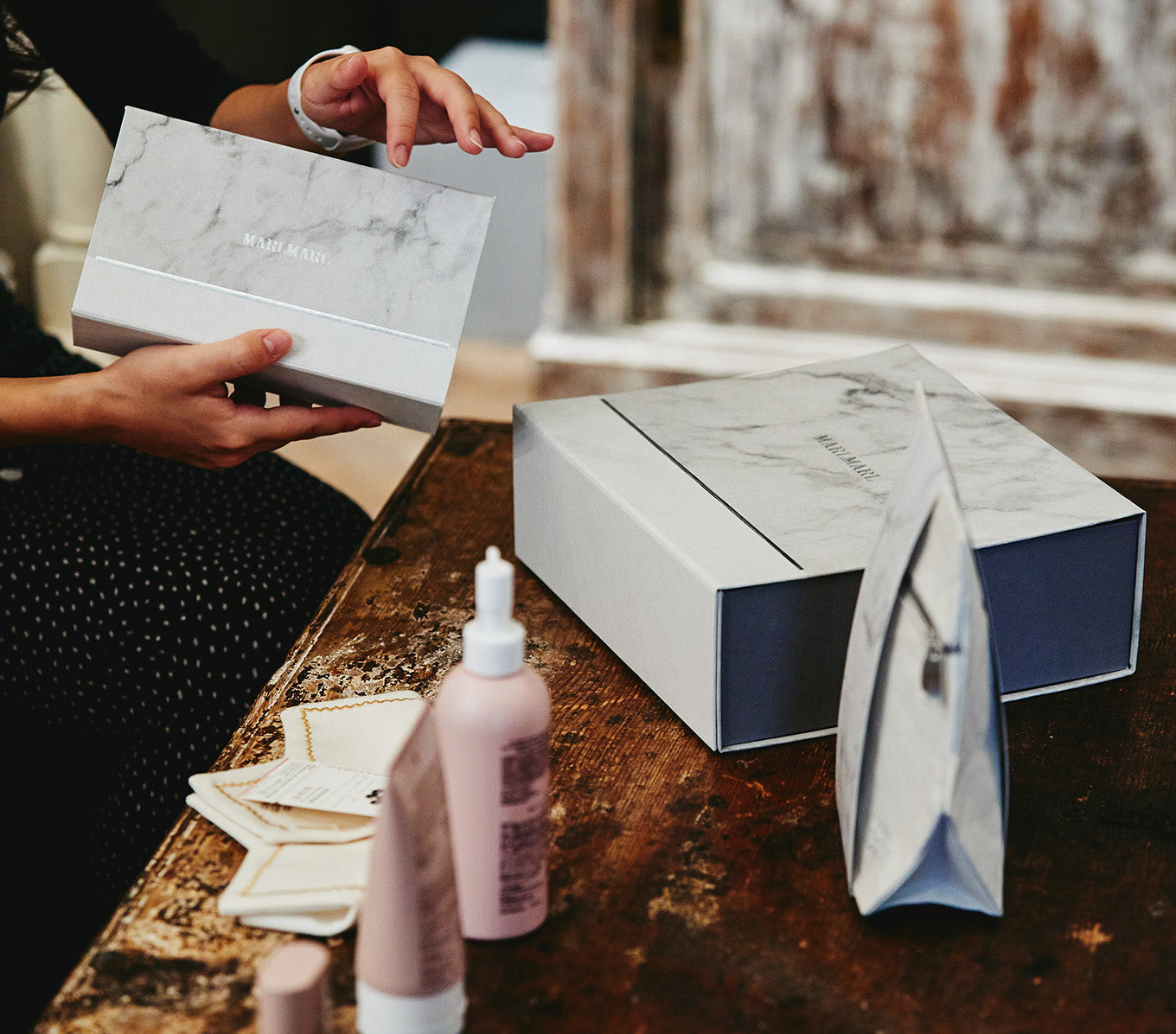 グレーのマーブル模様を取り入れたギフトボックスやオリジナルのメッセージカード、熨斗(のし)や袱紗(ふくさ)をモダンにアレンジしたラッピングなど、オリジナリティあふれるラッピングも注目を集めている。