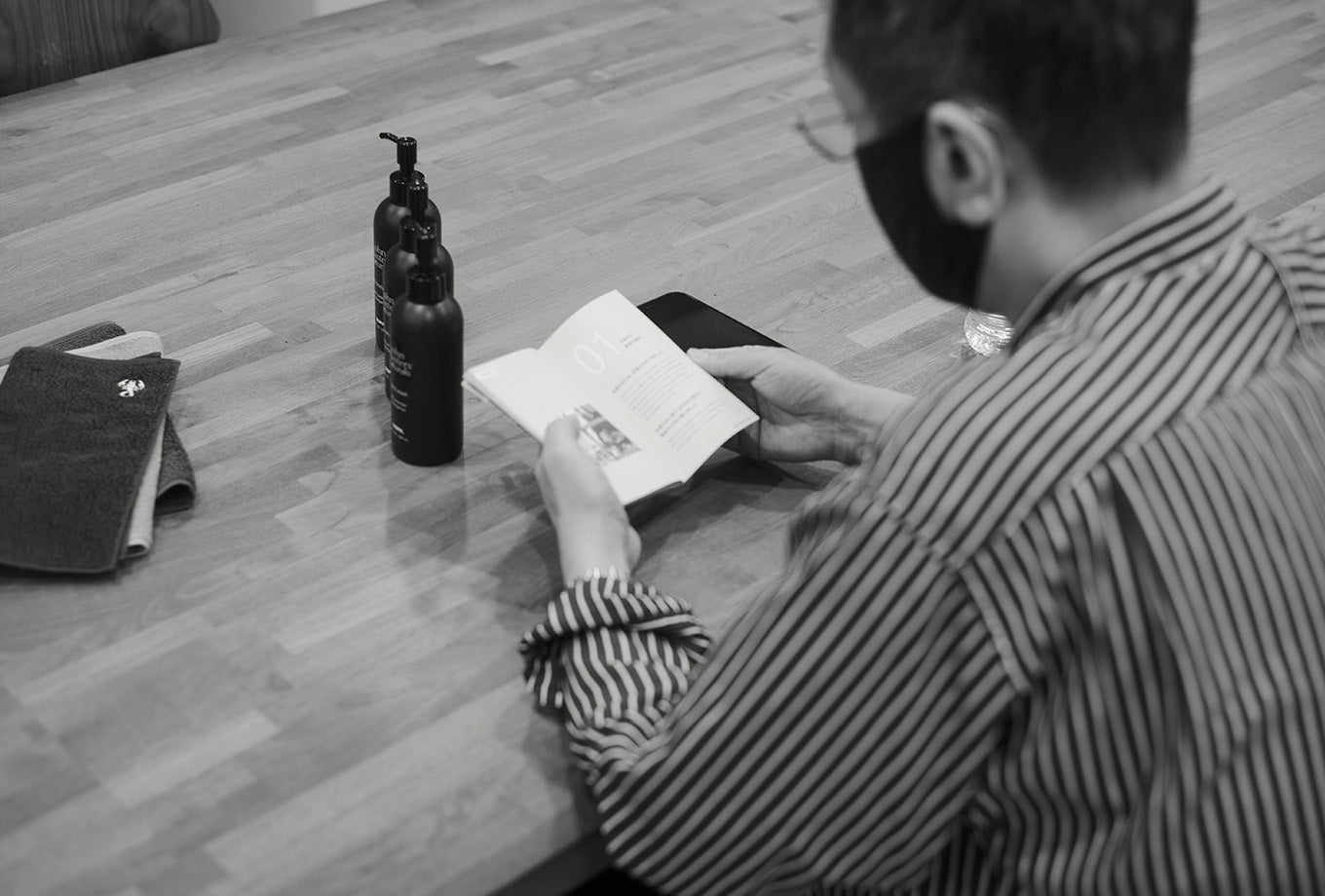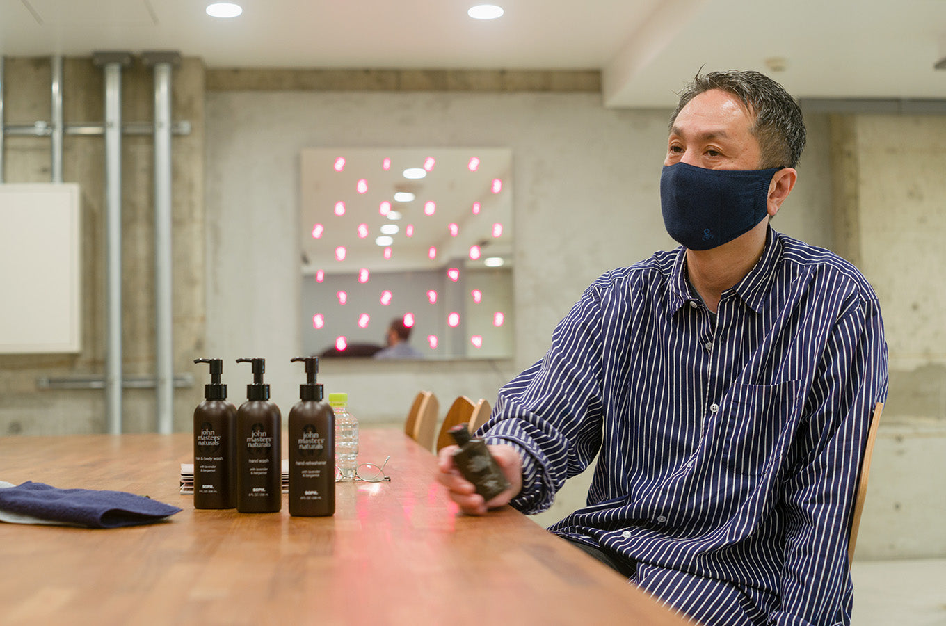 「2019年6月に、共通の知人の紹介でジョンマスターオーガニックの社長、野田義宗さんと出会ったのがすべての始まり。もともとジョンマスターオーガニックは知っていましたし、普通に消費者として使っていましたが、野田さんと出会って音楽など共通の趣味で意気投合。いろいろ話しているなかでジョンマスターオーガニックの製品にハンドリフレッシュナーがあると知り、コロナ禍の状況でお客さんに提供すれば喜んでもらえるのでは…と思ったのです。それまでコスメ業界とのコラボは経験がありませんでしたが、ジョンマスターオーガニックの担当者と何度もやり取りをしてイメージを伝え、非常に満足するものができ上がりました」