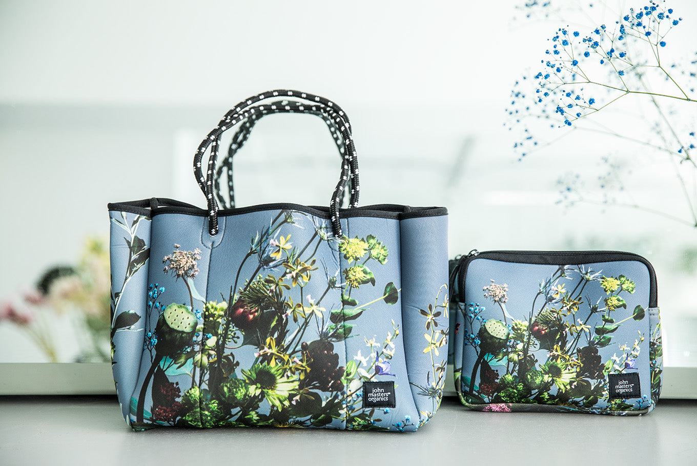「ホリデーコレクションでジョンマスターオーガニックさんと一緒に作ったトートバッグとポーチは、まず地球をイメージしたグリーンとブラウン、それからedenworks のイメージカラーであるブルーの3 つを中心に考えました。裏、表、横、どこから見ても少しずつ異なるように、それからお花がどこから生えているのか、起点がはっきりとわからないようなデザインになっています。イメージヴィジュアルの撮影用に作った円形のオブジェも、円環は地球や平和のイメージ、その中にある花が自由に飛んでいるイメージを形にしました」