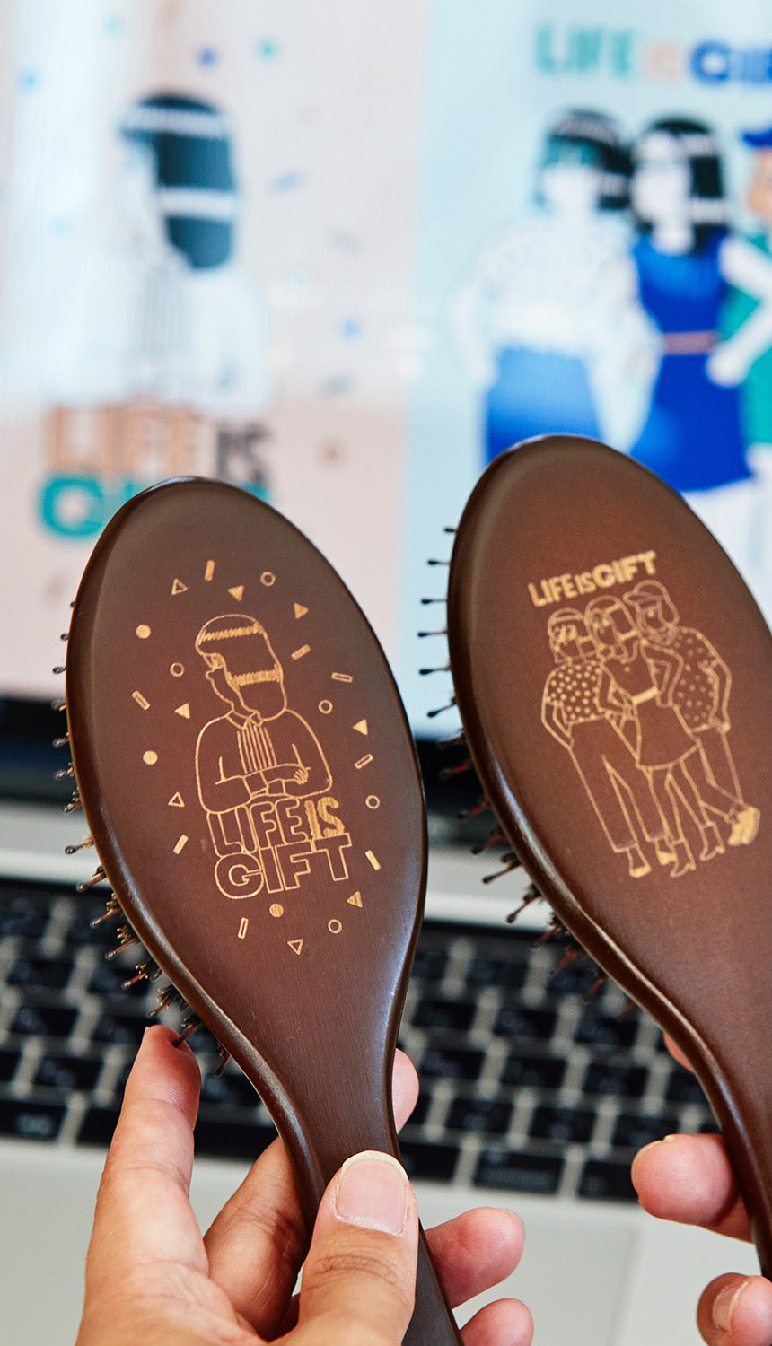 コラボレーションアイテムは刻印ブラシのギフトセット。ジョンマスターオーガニックのギフトコンセプト「LIFE IS GIFT-人生は贈り物」をテーマに、ブラシに刻印するイラストをJUN OSONが描いた。