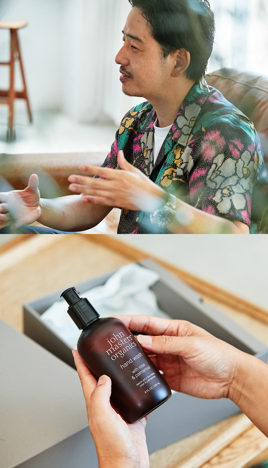 今回のテーマは“ギフト”。だが実は自身はあまりギフトが得意ではないのだとか。「選ぶのが苦手で、奥さんにも何が欲しいか直接聞いてしまっていましたが、ジョンマスターオーガニックなら男性でも手に取りやすくて、ギフト選びにいいんじゃないかと感じましたね。逆に女性が男性に贈るのにもよさそう。デザインもユニセックスでいいですよね。コスメを使い慣れない男性にも、“ちゃんとしていて気を使っているもの”として喜ばれると思います」