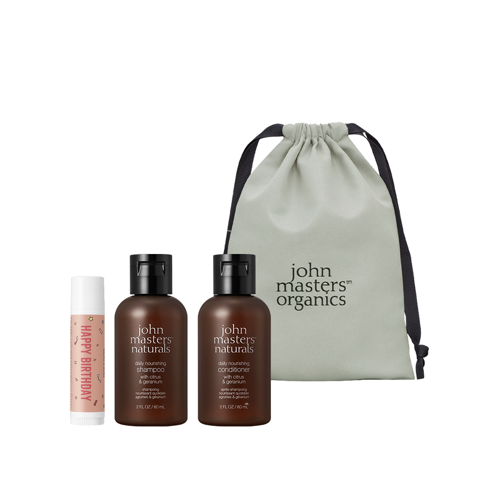 「HAPPY BIRTHDAY」のメッセージがデザインされた限定ラベルのリップクリームのギフトセット。ベーシックケアのシャンプー&コンディショナーのミニサイズとセットにいたしました。