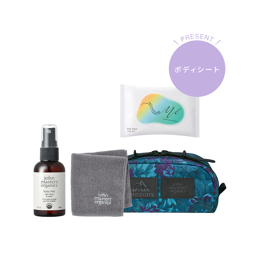 ボディシート(¥990税込)をプレゼント!アウトドアブランドならではの耐久性と機能性に優れたGREGORYコラボポーチと、リフレッシュしたい時におすすめのアロマミスト、オリジナルタオルハンカチのセット。 今なら、ひんやりクールなボディシートをプレゼント。