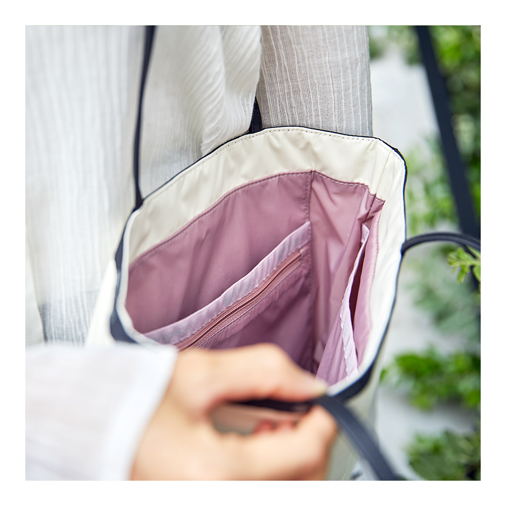 通勤通学などデイリーユースにぴったりの、スリムな縦型のトートバッグ。A4サイズの書類やパソコンが入るスナップボタン付きのポケットと、お財布など貴重品の収納に便利なファスナーポケットが付いているので、バッグの中の整理整頓も◎しっとり感が一日中続くヘアミルクのミニサイズをプレゼント。