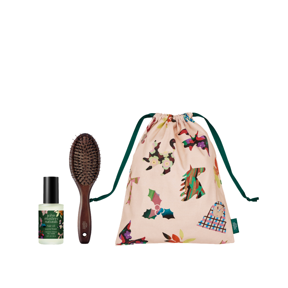 高保湿ながらベタつかずサラサラに仕上がるホリデー限定フレグランスヘアオイルと、プロ仕様のスタイリングとブローが叶うブラシのコフレ。贈る相手の名前をブラシに刻印すれば、世界でたったひとつのギフトに。心ときめくモチーフがあしらわれたリミテッドバッグをプレゼント。【パープルフラワーの香り】グリーンとベリー、爽やかさと甘さのハーモニー。