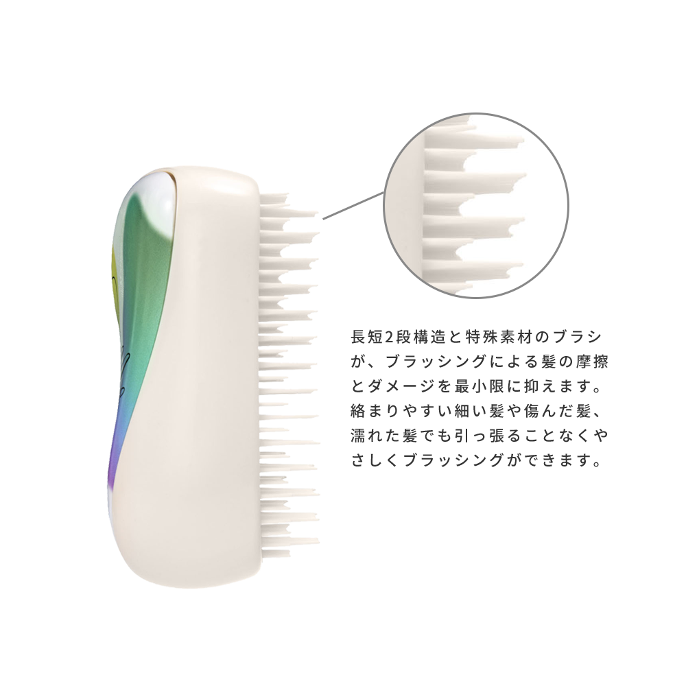 ベースとなるのは、持ち歩きにぴったりな「コンパクトスタイラー」。長短2段構造の特殊素材でできたブラシが、もつれた髪を根元からやさしく解きほぐし、同時にキューティクルを美しく整えます。ブラシ部分を保護するカバーが付いているので、ブラシが折れ曲がる心配もありません。
