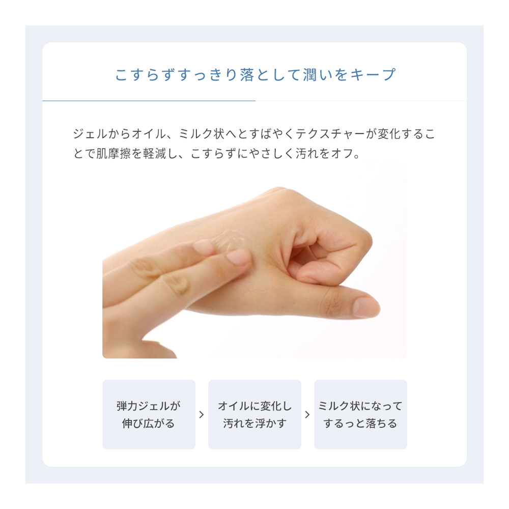 肌なじみがよく保湿力の高いヒマワリ油※2やシア脂、アルガニアスピノサ核油(アルガンオイル)、ホホバ種子油などの植物オイルを配合した美容成分96%以上※3のオイルクレンジングジェル。厚みと弾力のあるジェルからオイル、すすぎやすいミルク状へと3段階にすばやくテクスチャーが変化することで肌摩擦を軽減し、潤いを残しながらも汚れをすっきりと落として輝くような透明肌へ。さらにビルベリー葉エキスが潤いとハリを与え、乾燥でくすんで見える肌を明るい印象に導きます。グレープフルーツとネロリをブレンドした透明感のある爽やかな香りで、一日の終わりに自分を解きほぐすような至福のスキンケアを。