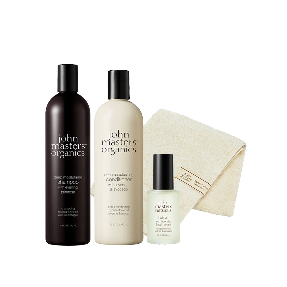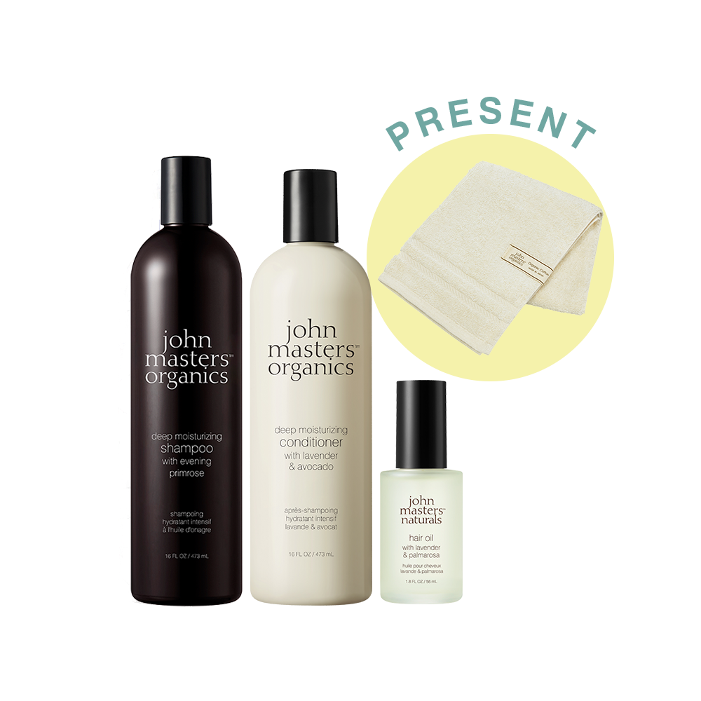 【約3ヵ月サイズのセット】なめらかな泡で洗い上げながら乾燥しがちな頭皮と髪を潤し、しっとりしたなめらかな髪へ導くモイスチャライジングシャンプー&コンディショナーと高保湿ながらライトな使用感で軽やかに潤うヘアオイルのセット。今なら、オリジナルフェイスタオルをプレゼント。