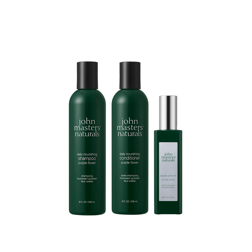 ホリデー限定の香りのシャンプー、コンディショナーに、HIROMUさんセレクトのアクアパフューム(アロマティックウッズ)をセットに。