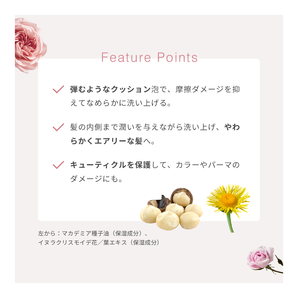 クッション泡で髪と頭皮を守りながら洗うローズシャンプ―。髪にやさしいヤシ油由来のアミノ酸系洗浄成分に、泡立ち・泡持ちをサポートする自然由来成分を配合。キメ細かい豊かな泡が、洗髪時の絡みやきしみによるダメージを軽減します。さらにマカデミア種子油やブロッコリー種子油が髪と地肌に潤いを与え、保湿成分のユズ果実エキスがキューティクルを保護。指通りなめらかでやわらかいうるふわな髪へ導きます。優雅なダマスクローズの香りに包まれて、とろけるような至福のバスタイムを。