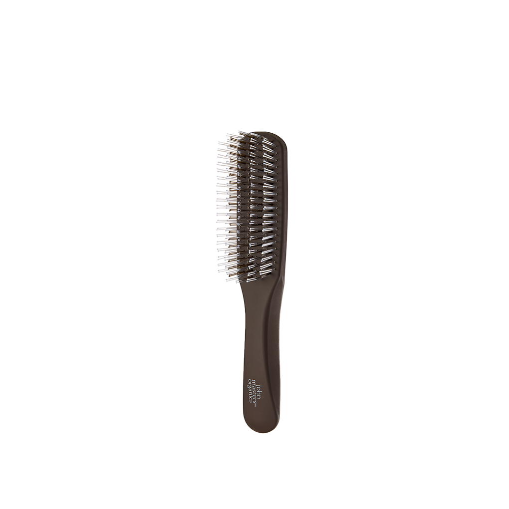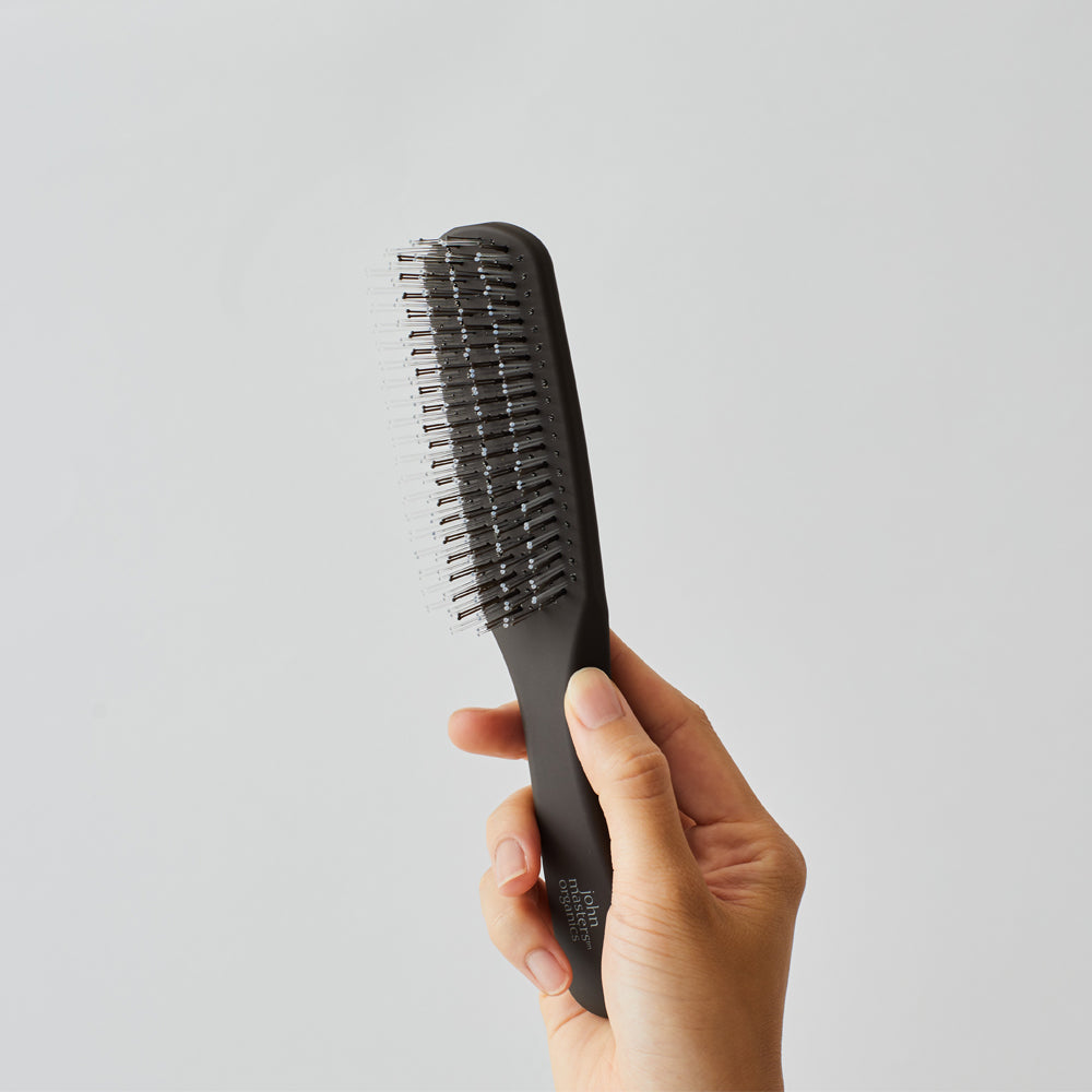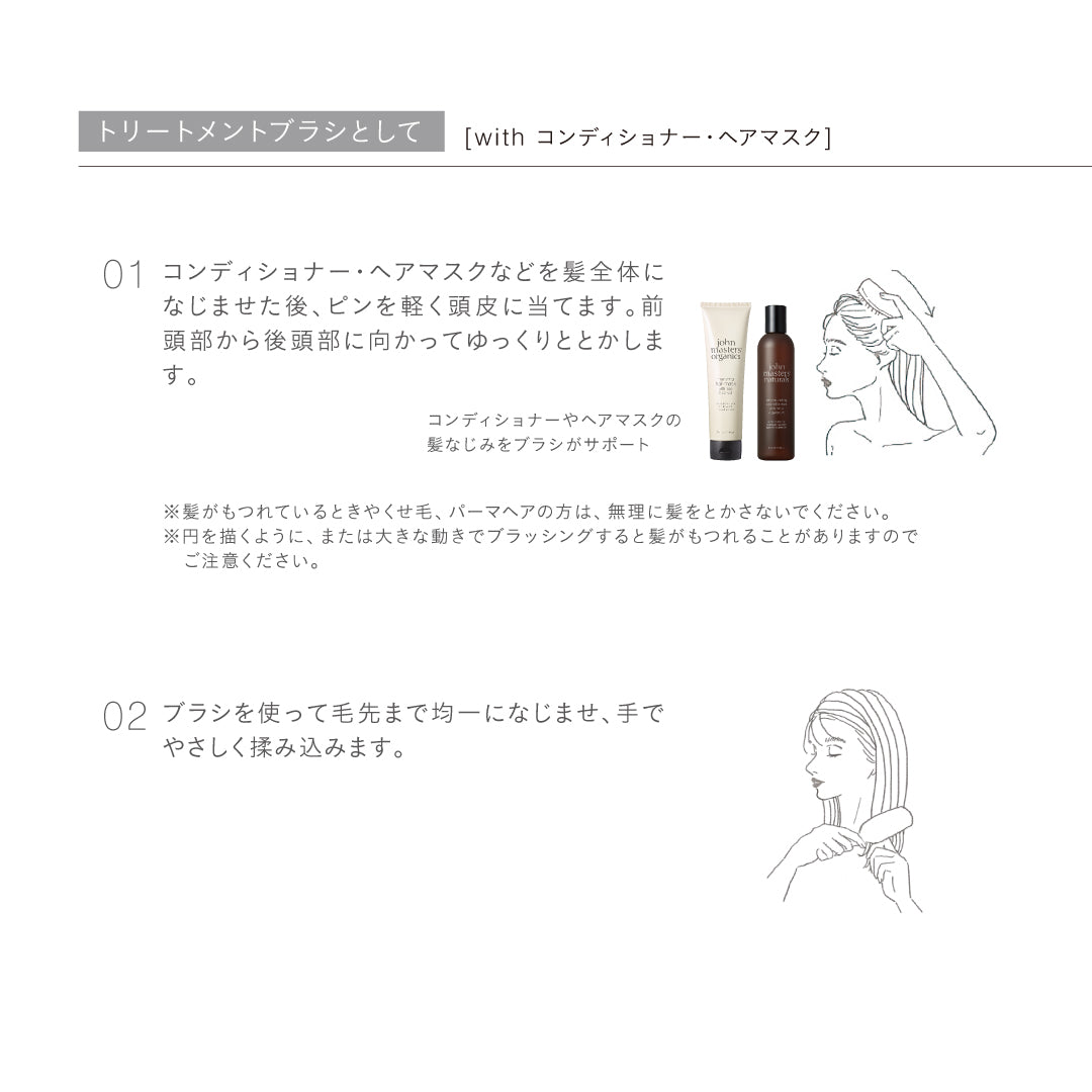 (トリートメントブラシ)コンディショナーやヘアマスク等を髪全体になじませます。ブラシの柄を持ち、前頭部から後頭部に向かってゆっくりととかし毛先までよくなじませます。