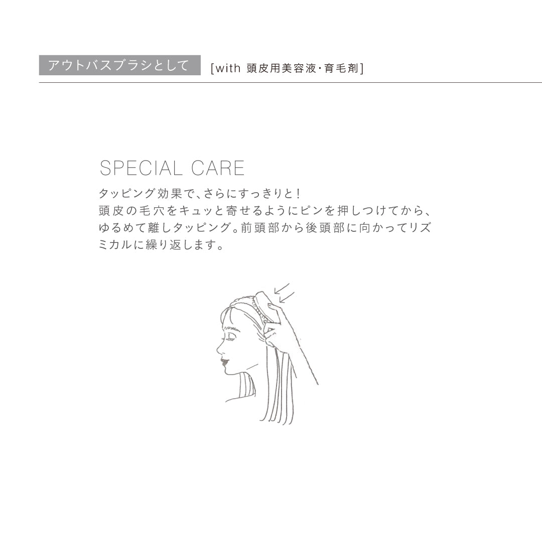 (アウトバスブラシ)頭皮用美容液や育毛剤を頭皮全体になじませます。ピンが頭皮から離れないよう軽く押し当て、左右の耳の後ろ、えり足、こめかみから頭頂部に向かってゆっくりやさしくブラッシングします。最後に前頭部から後頭部に向かって流すようにとかし全 体をなじませてください。