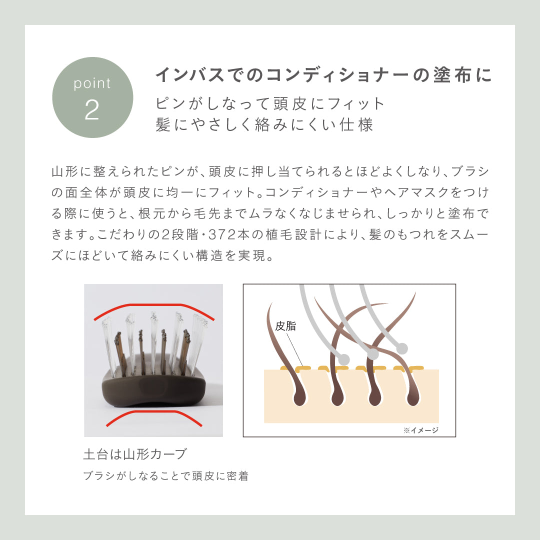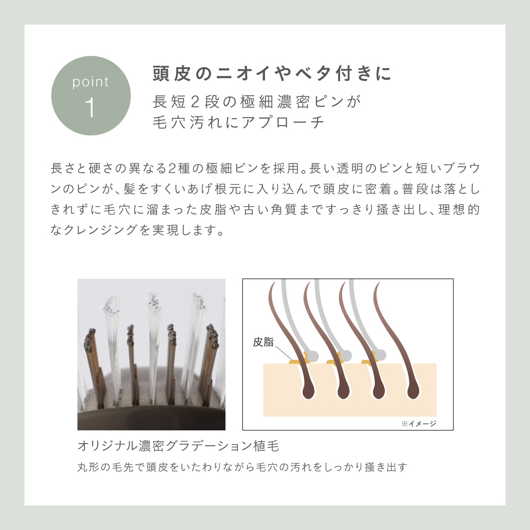 ディープクレンジングで毛穴ケア。澄みわたるように、髪の根元から美しく。毛穴のクレンジングと頭皮マッサージを叶えるクレンジングブラシ。太さの異なる極細ピンを繊細な段差で植えた“濃密グラデーション植毛”。硬さも異なる2種類のピンが、頭皮をやさしく刺激しながら、毛穴の汚れを掻き出します。毎日のルーティンに取り入れて、クレンジングをワンランクアップ。