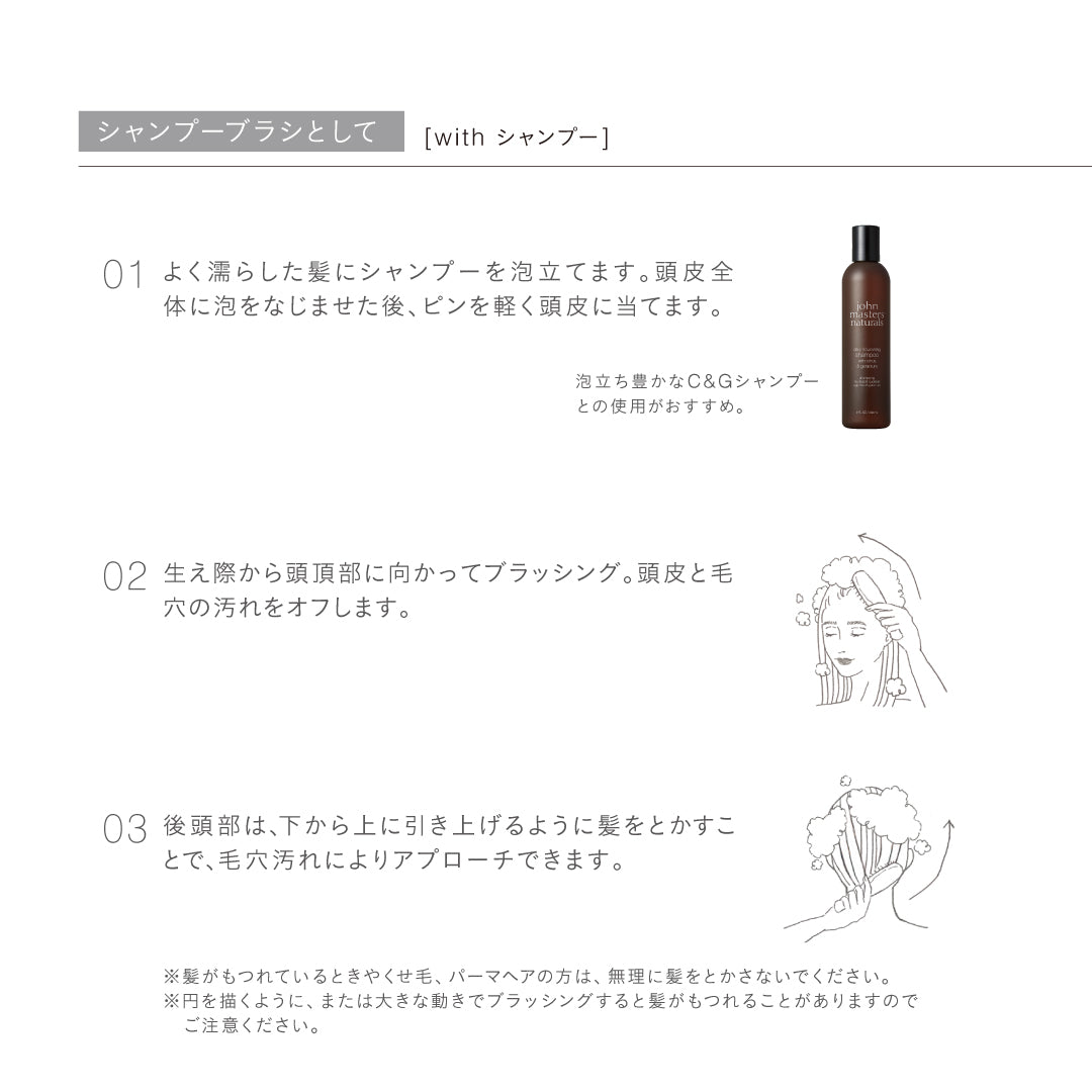 (シャンプーブラシ)よく濡らした髪にシャンプーをしっかりと泡立ててから使用します。ブラシの上部を持ち、生え際から頭頂部に向かって小刻みに動かしてブラッシングします。後頭部は下から上に引き上げるようにとかしてください。