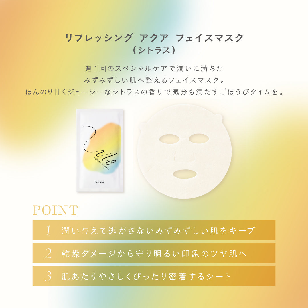 週1回のスペシャルケアで潤いに満ちたみずみずしい肌へ整えるフェイスマスク。角質層まで浸透しやすい加水分解ヒアルロン酸などの保湿成分を配合。肌のすみずみまで潤いを届けてやわらかいツヤ肌へと整えます。さらに、ベタインやグリコシルトレハロースが取り込んだ水分を蓄え、スクワランやザクロ種子油が肌表面にフタをして潤いをキープ。みずみずしさやハリを保ちます。ほんのり甘くジューシーな香りに包まれて肌を満たすひとときが、日々に澄んだ軽やかな風を運んで。
