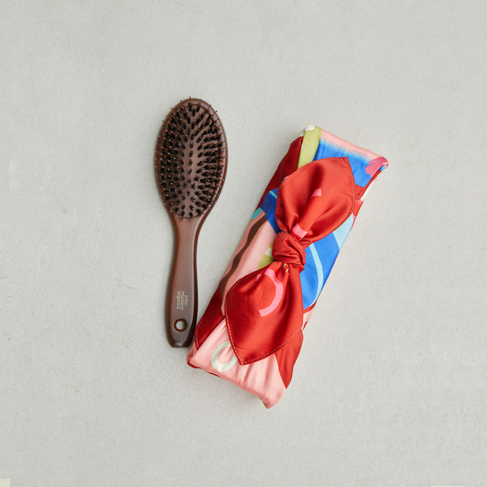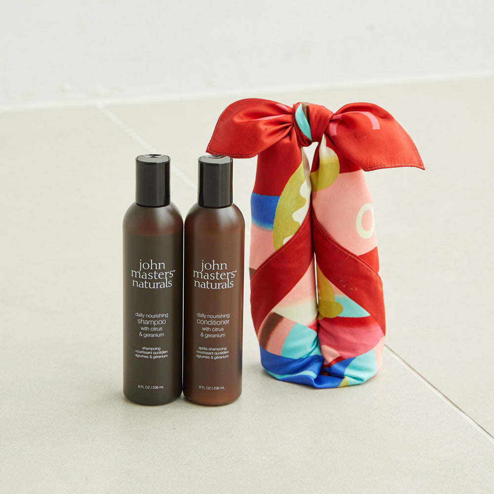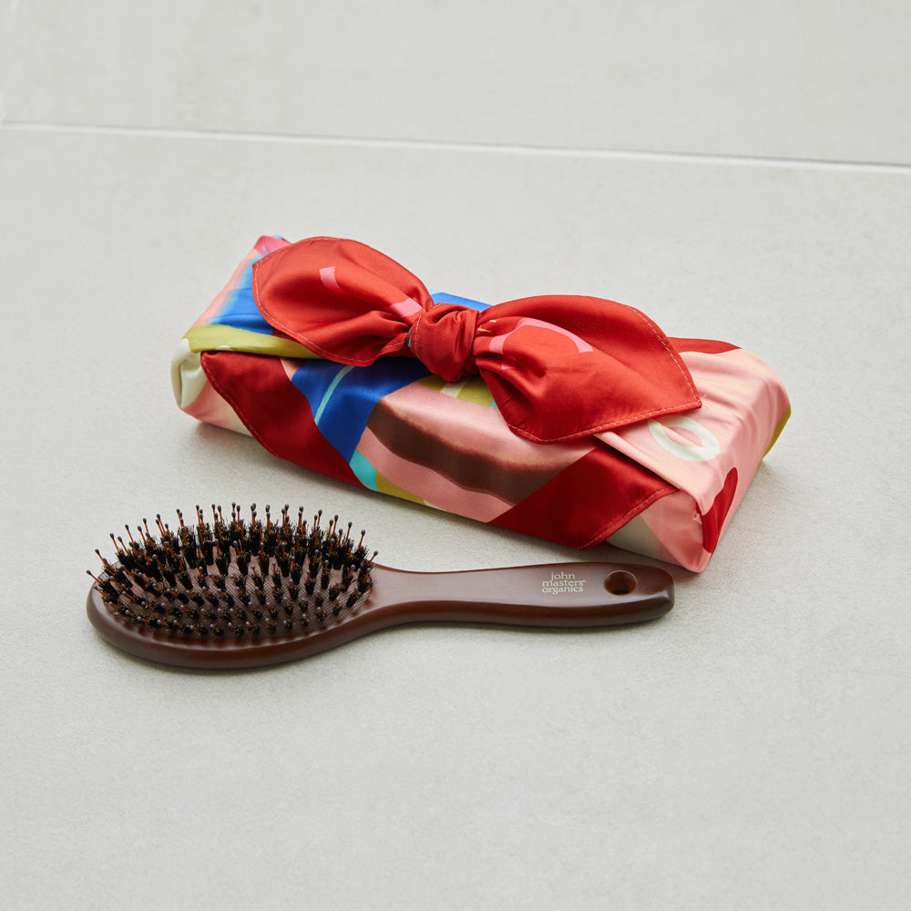 2026年の干支の馬が描かれた風呂敷。ヘアケアのボトルやブラシなど、大切な方への贈り物を華やかに演出します。